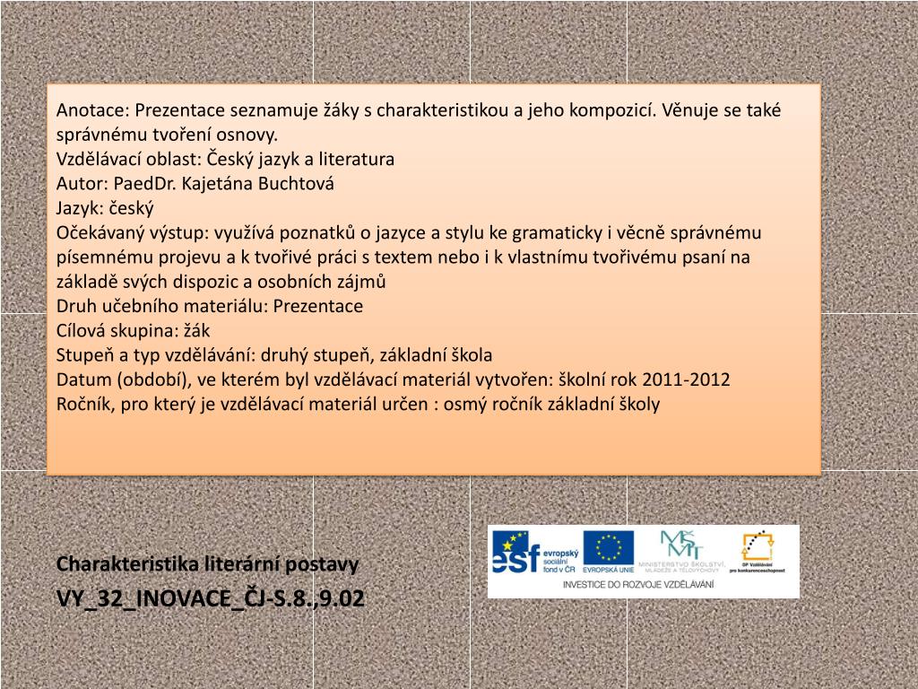 Anotace: Prezentace seznamuje žáky s charakteristikou a jeho kompozicí. Věnuje se také správnému tvoření osnovy. Vzdělávací oblast: Český jazyk a literatura Autor: PaedDr. Kajetána Buchtová Jazyk: český Očekávaný výstup: využívá poznatků o jazyce a stylu ke gramaticky i věcně správnému písemnému projevu a k tvořivé práci s textem nebo i k vlastnímu tvořivému psaní na základě svých dispozic a osobních zájmů Druh učebního materiálu: Prezentace Cílová skupina: žák Stupeň a typ vzdělávání: druhý stupeň, základní škola Datum (období), ve kterém byl vzdělávací materiál vytvořen: školní rok 2011-2012 Ročník, pro který je vzdělávací materiál určen : osmý ročník základní školy Charakteristika literární postavy VY_32_INOVACE_ČJ-S.8.,9.02