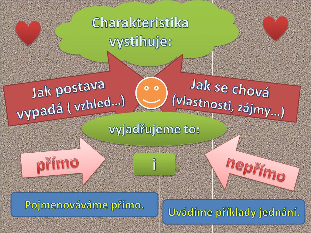 Charakteristika vystihuje: Jak postava vypadá ( vzhled…) Jak se chová (vlastnosti, zájmy…) vyjadřujeme to: přímo nepřímo i Pojmenováváme přímo. Uvádíme příklady jednání.