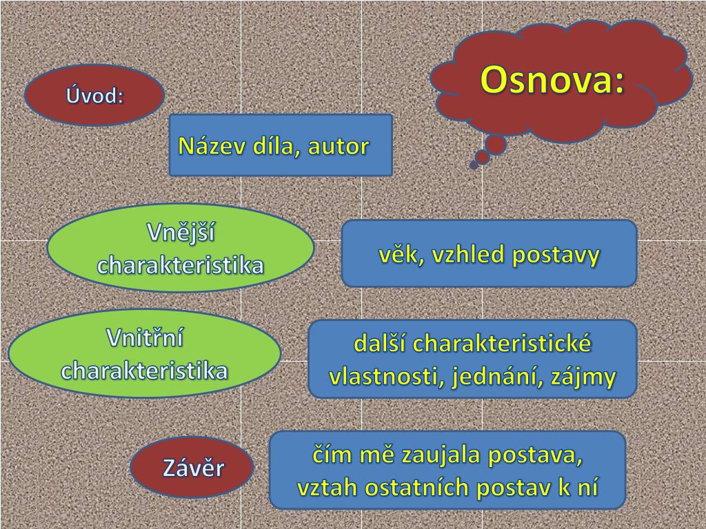 Osnova: Úvod: Název díla, autor Vnější charakteristika věk, vzhled postavy Vnitřní charakteristika další charakteristické vlastnosti, jednání, zájmy čím mě zaujala postava, vztah ostatních postav k ní Závěr