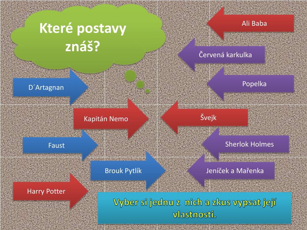 Které postavy znáš? Ali Baba Červená karkulka Popelka D´Artagnan Kapitán Nemo Švejk SherlokHolmes Faust Brouk Pytlík Jeníček a Mařenka HarryPotter Vyber si jednu z nich a zkus vypsat její vlastnosti.