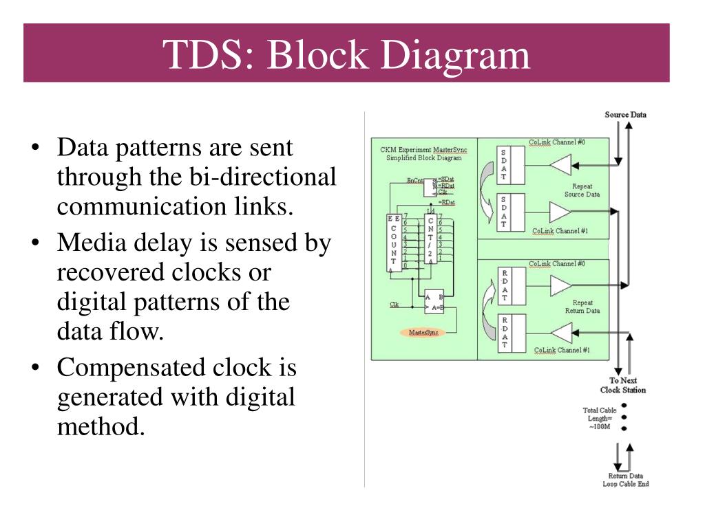 TDS: Block Diagram • Data patterns are sent through the bi-directional communication links. • Media delay is sensed by recovered clocks or digital patterns of the data flow. • Compensated clock is generated with digital method.