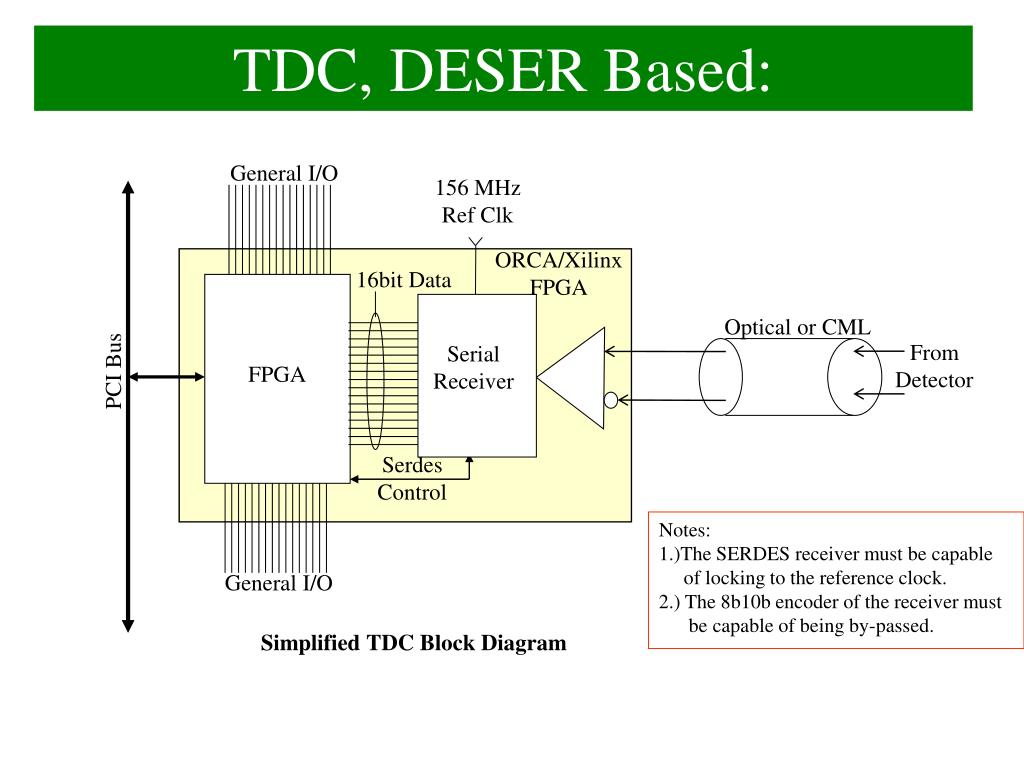 TDC, DESER Based: General I/O 156 MHz Ref Clk ORCA/Xilinx FPGA 16bit Data Optical or CML From Detector Serial Receiver PCI Bus FPGA Serdes Control Notes: 1.)The SERDES receiver must be capable of locking to the reference clock. 2.) The 8b10b encoder of the receiver must be capable of being by-passed. General I/O Simplified TDC Block Diagram