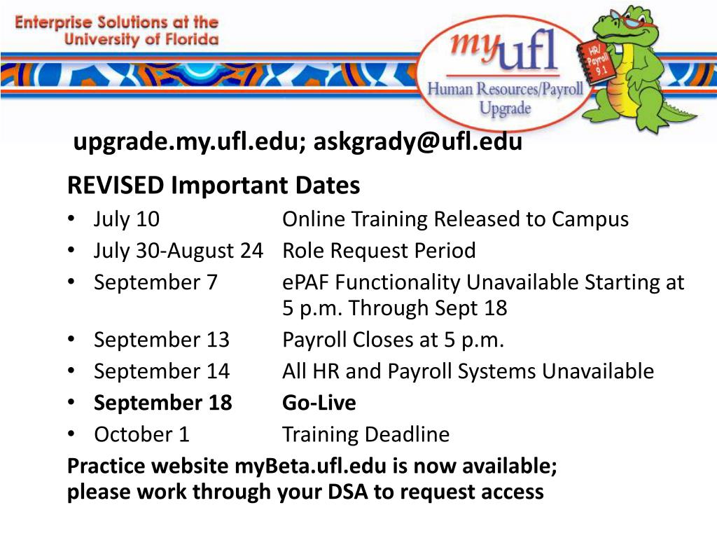 upgrade.my.ufl.edu; askgrady@ufl.edu REVISED Important Dates • July 10 Online Training Released to Campus • July 30-August 24 Role Request Period • September 7 ePAF Functionality Unavailable Starting at 5 p.m. Through Sept 18 • September 13 Payroll Closes at 5 p.m. • September 14 All HR and Payroll Systems Unavailable • September 18 Go-Live • October 1 Training Deadline Practice website myBeta.ufl.edu is now available; please work through your DSA to request access