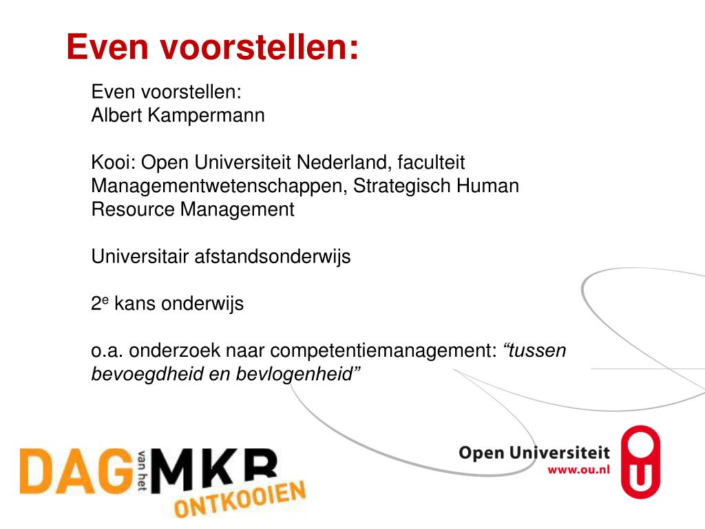Even voorstellen: Even voorstellen: Albert Kampermann Kooi: Open Universiteit Nederland, faculteit Managementwetenschappen, Strategisch Human Resource Management Universitair afstandsonderwijs 2e kans onderwijs o.a. onderzoek naar competentiemanagement: “tussen bevoegdheid en bevlogenheid”