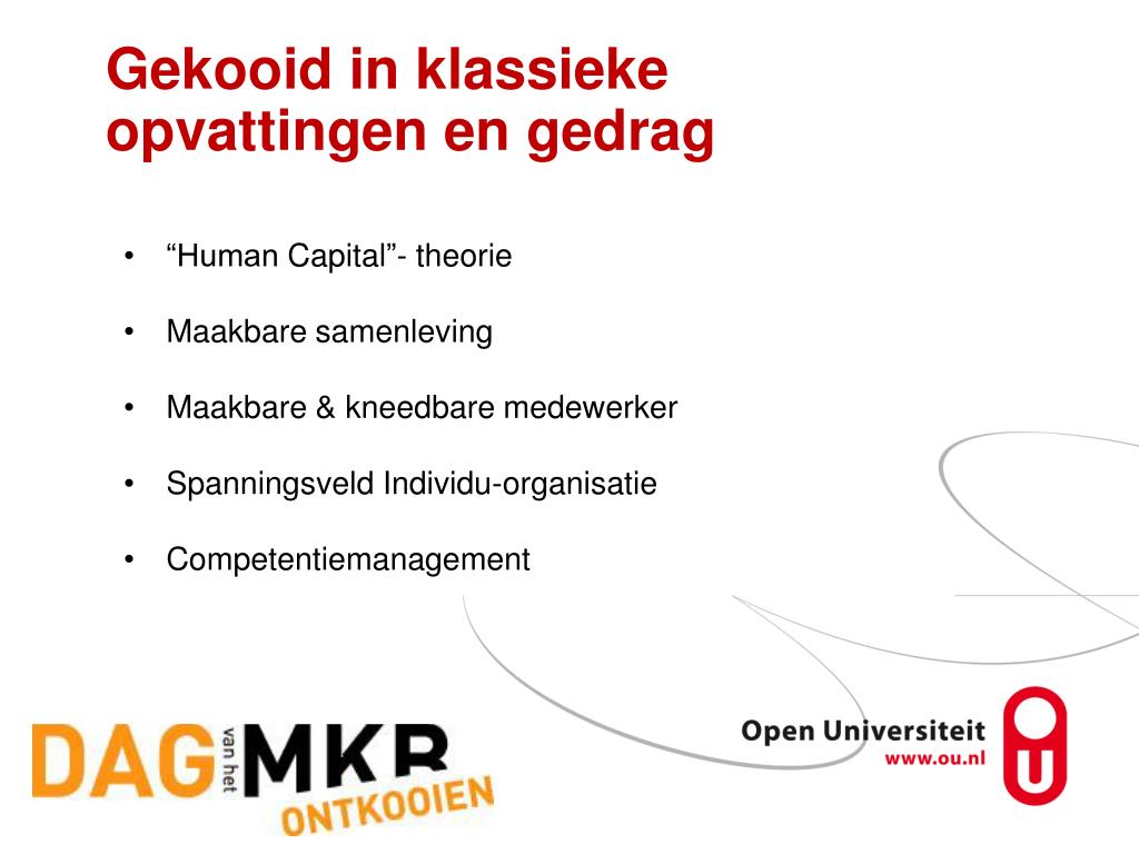 Gekooid in klassieke opvattingen en gedrag • “Human Capital”- theorie • Maakbare samenleving • Maakbare & kneedbare medewerker • Spanningsveld Individu-organisatie • Competentiemanagement