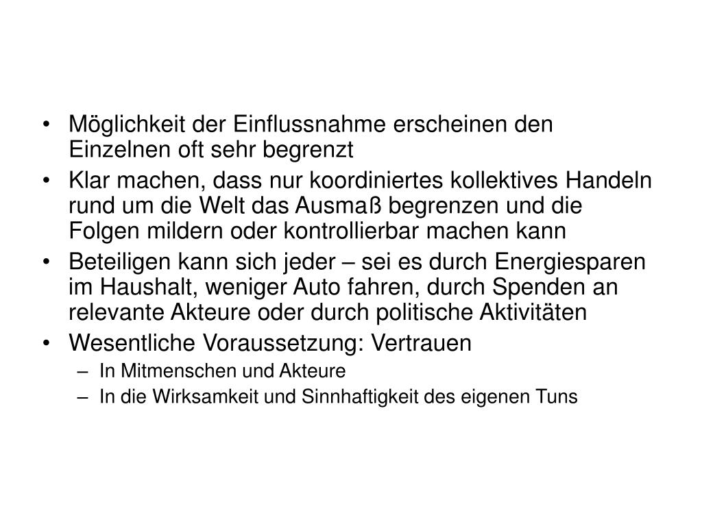 Möglichkeit der Einflussnahme erscheinen den Einzelnen oft sehr begrenzt • Klar machen, dass nur koordiniertes kollektives Handeln rund um die Welt das Ausmaß begrenzen und die Folgen mildern oder kontrollierbar machen kann • Beteiligen kann sich jeder – sei es durch Energiesparen im Haushalt, weniger Auto fahren, durch Spenden an relevante Akteure oder durch politische Aktivitäten • Wesentliche Voraussetzung: Vertrauen • In Mitmenschen und Akteure • In die Wirksamkeit und Sinnhaftigkeit des eigenen Tuns