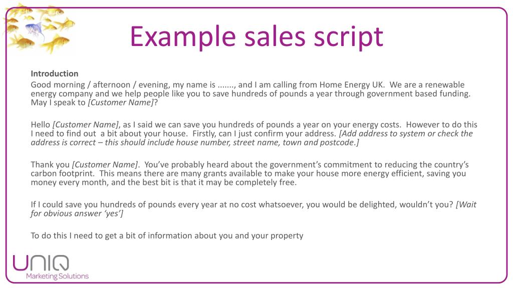 Example sales script Introduction Good morning / afternoon / evening, my name is ......., and I am calling from Home Energy UK. We are a renewable energy company and we help people like you to save hundreds of pounds a year through government based funding. May I speak to [Customer Name]? Hello [Customer Name], as I said we can save you hundreds of pounds a year on your energy costs. However to do this I need to find out a bit about your house. Firstly, can I just confirm your address. [Add address to system or check the address is correct – this should include house number, street name, town and postcode.] Thank you [Customer Name]. You’ve probably heard about the government’s commitment to reducing the country’s carbon footprint. This means there are many grants available to make your house more energy efficient, saving you money every month, and the best bit is that it may be completely free. If I could save you hundreds of pounds every year at no cost whatsoever, you would be delighted, wouldn’t you? [Wait for obvious answer ‘yes’] To do this I need to get a bit of information about you and your property