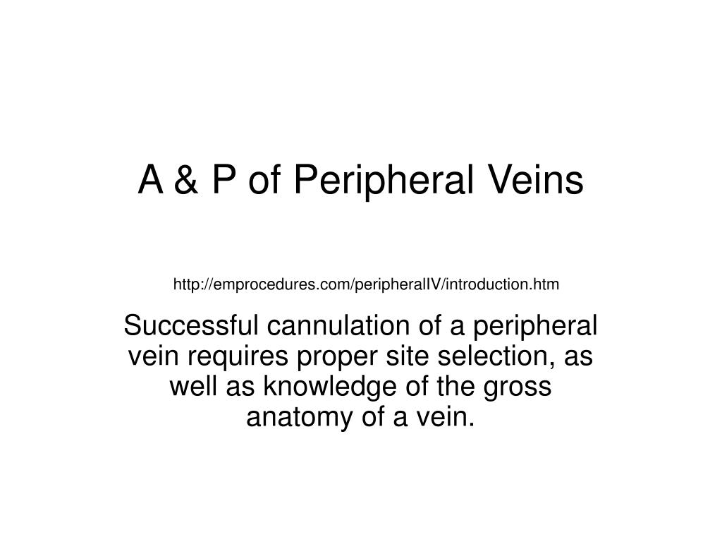 A & P of Peripheral Veinshttp://emprocedures.com/peripheralIV/introduction.htm Successful cannulation of a peripheral vein requires proper site selection, as well as knowledge of the gross anatomy of a vein.