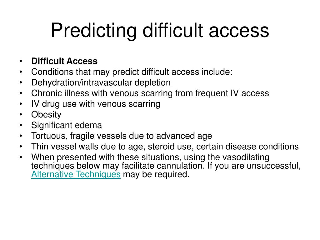 Predicting difficult access • Difficult Access • Conditions that may predict difficult access include: • Dehydration/intravascular depletion • Chronic illness with venous scarring from frequent IV access • IV drug use with venous scarring • Obesity • Significant edema • Tortuous, fragile vessels due to advanced age • Thin vessel walls due to age, steroid use, certain disease conditions • When presented with these situations, using the vasodilating techniques below may facilitate cannulation. If you are unsuccessful, Alternative Techniques may be required.