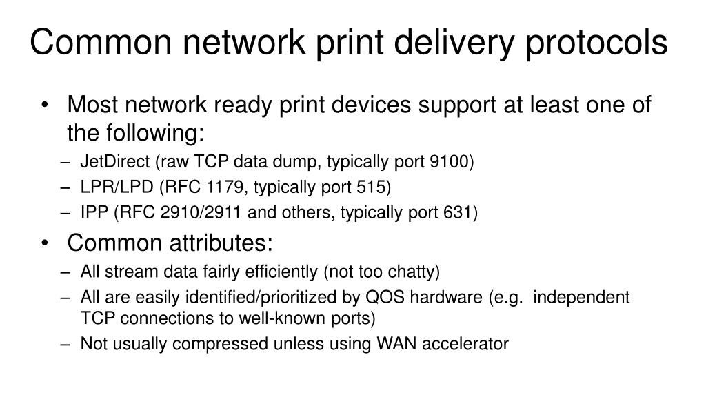 Common network print delivery protocols • Most network ready print devices support at least one of the following: • JetDirect (raw TCP data dump, typically port 9100) • LPR/LPD (RFC 1179, typically port 515) • IPP (RFC 2910/2911 and others, typically port 631) • Common attributes: • All stream data fairly efficiently (not too chatty) • All are easily identified/prioritized by QOS hardware (e.g. independent TCP connections to well-known ports) • Not usually compressed unless using WAN accelerator
