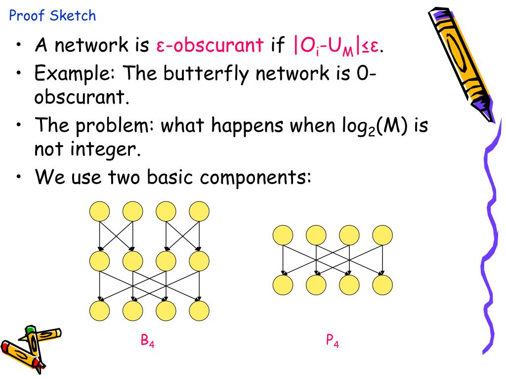 Proof Sketch • A network is ε-obscurant if |Oi-UM|≤ε. • Example: The butterfly network is 0-obscurant. • The problem: what happens when log2(M) is not integer. • We use two basic components: B4 P4
