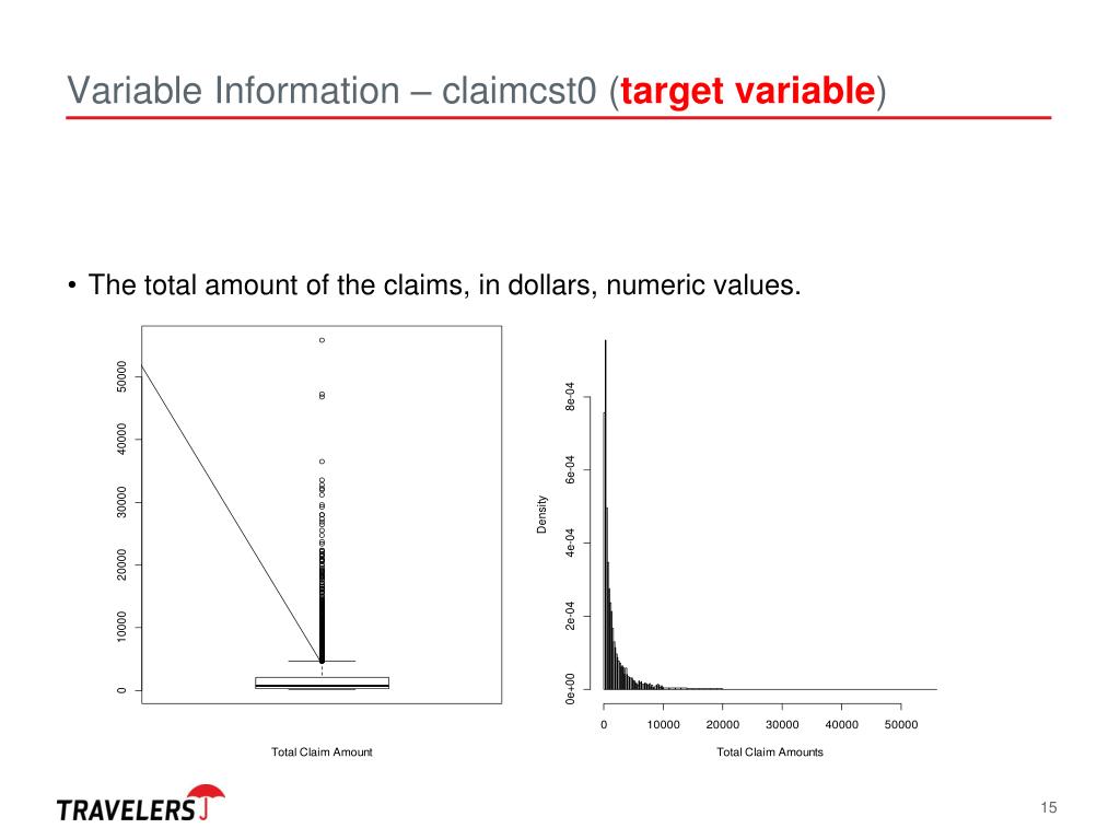 Variable Information – claimcst0 (target variable) • The total amount of the claims, in dollars, numeric values.