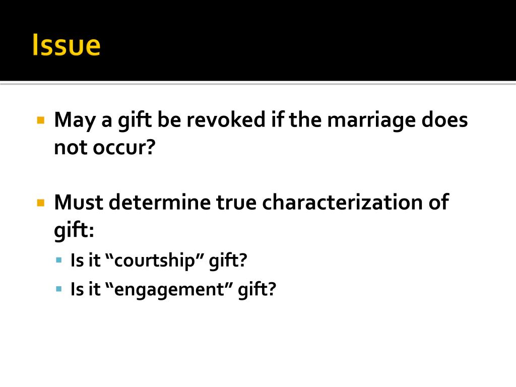 Issue • May a gift be revoked if the marriage does not occur? • Must determine true characterization of gift: • Is it “courtship” gift? • Is it “engagement” gift?
