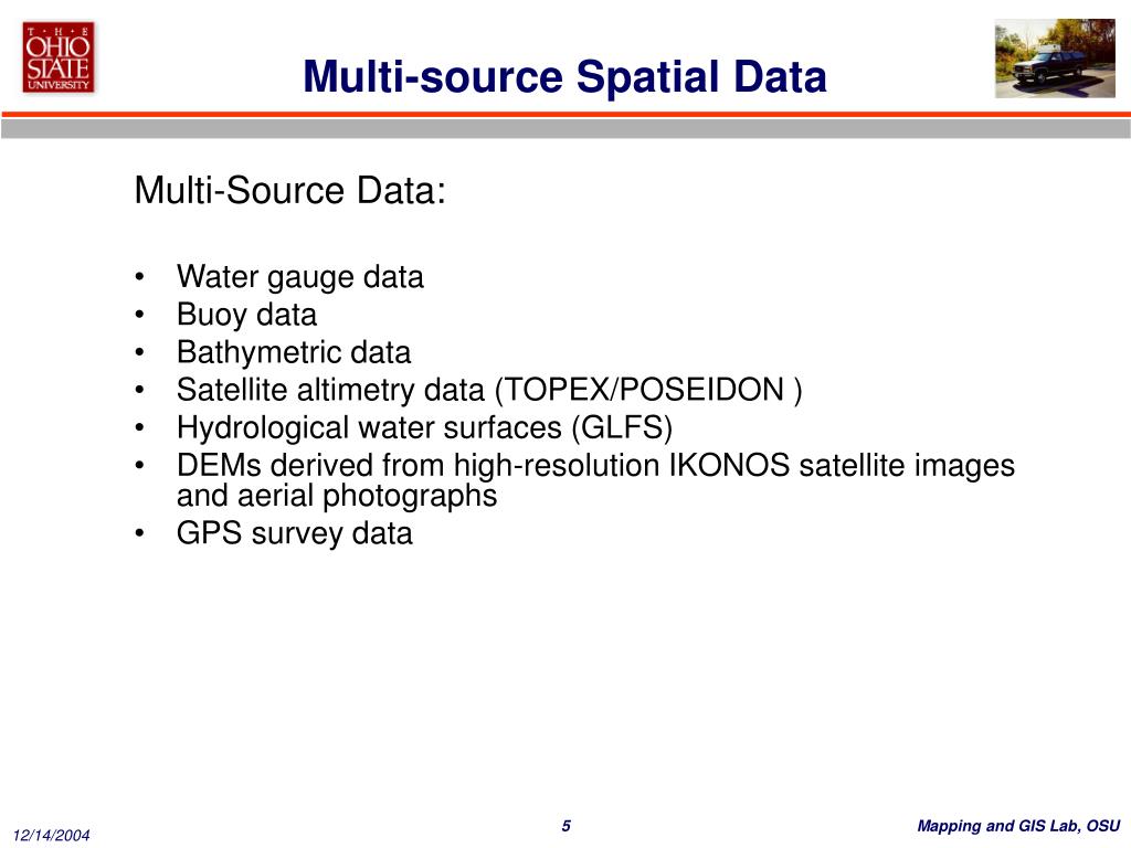 Multi-source Spatial Data Multi-Source Data: • Water gauge data • Buoy data • Bathymetric data • Satellite altimetry data (TOPEX/POSEIDON ) • Hydrological water surfaces (GLFS) • DEMs derived from high-resolution IKONOS satellite images and aerial photographs • GPS survey data
