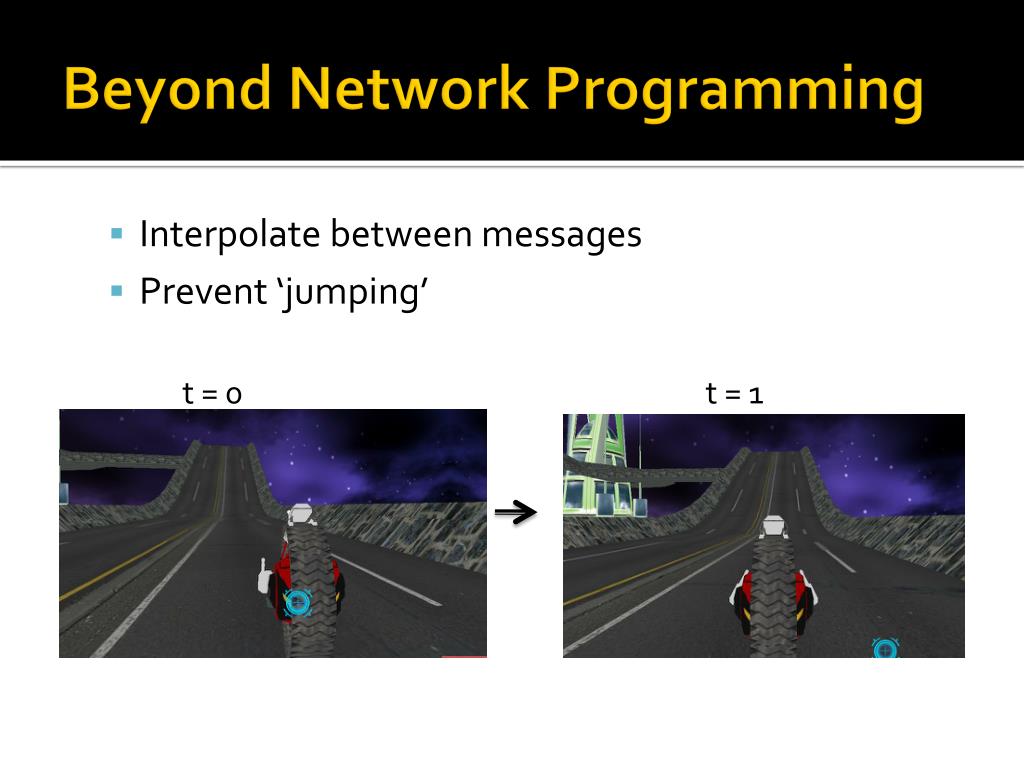 Beyond Network Programming • Interpolate between messages • Prevent ‘jumping’ t = 0 t = 1