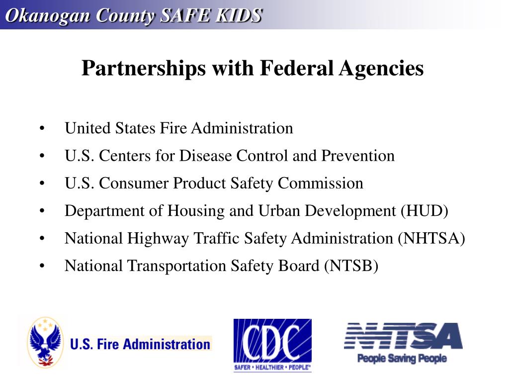 Okanogan County SAFE KIDS Partnerships with Federal Agencies • United States Fire Administration • • U.S. Centers for Disease Control and Prevention • U.S. Consumer Product Safety Commission • Department of Housing and Urban Development (HUD) • National Highway Traffic Safety Administration (NHTSA) • National Transportation Safety Board (NTSB)