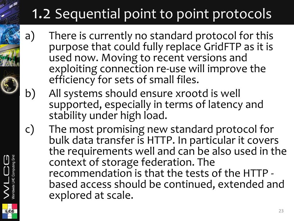 1.2 Sequential point to point protocols • There is currently no standard protocol for this purpose that could fully replace GridFTP as it is used now. Moving to recent versions and exploiting connection re-use will improve the efficiency for sets of small files. • All systems should ensure xrootd is well supported, especially in terms of latency and stability under high load. • The most promising new standard protocol for bulk data transfer is HTTP. In particular it covers the requirements well and can be also used in the context of storage federation. The recommendation is that the tests of the HTTP -based access should be continued, extended and explored at scale.