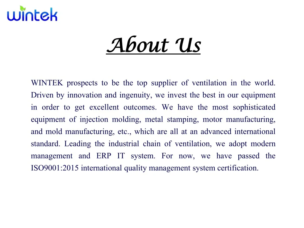 About Us WINTEK prospects to be the top supplier of ventilation in the world. Driven by innovation and ingenuity, we invest the best in our equipment in order to get excellent outcomes. We have the most sophisticated equipment of injection molding, metal stamping, motor manufacturing, and mold manufacturing, etc., which are all at an advanced international standard. Leading the industrial chain of ventilation, we adopt modern management and ERP IT system. For now, we have passed the ISO9001:2015 international quality management system certification.