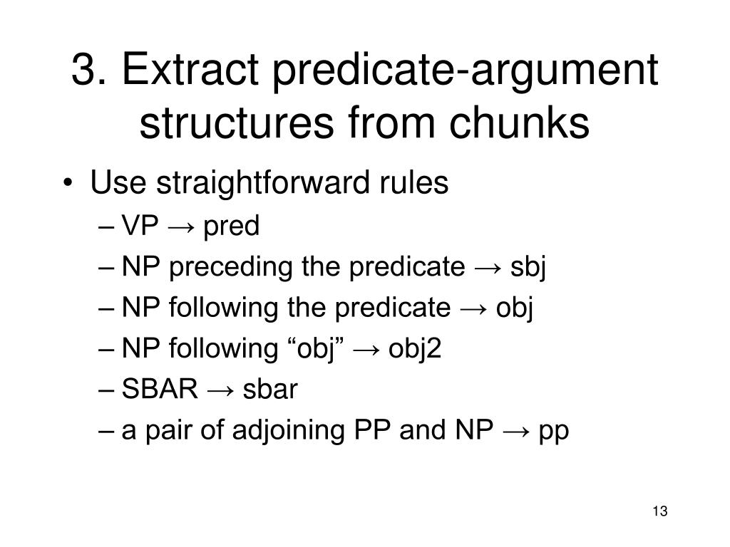 3. Extract predicate-argument structures from chunks • Use straightforward rules • VP → pred • NP preceding the predicate → sbj • NP following the predicate → obj • NP following “obj” → obj2 • SBAR → sbar • a pair of adjoining PP and NP → pp