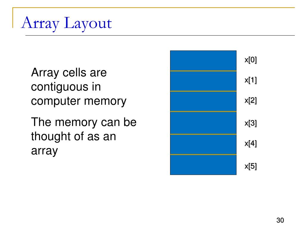 Array Layout x[0] Array cells are contiguous in computer memory The memory can be thought of as an array x[1] x[2] x[3] x[4] x[5]