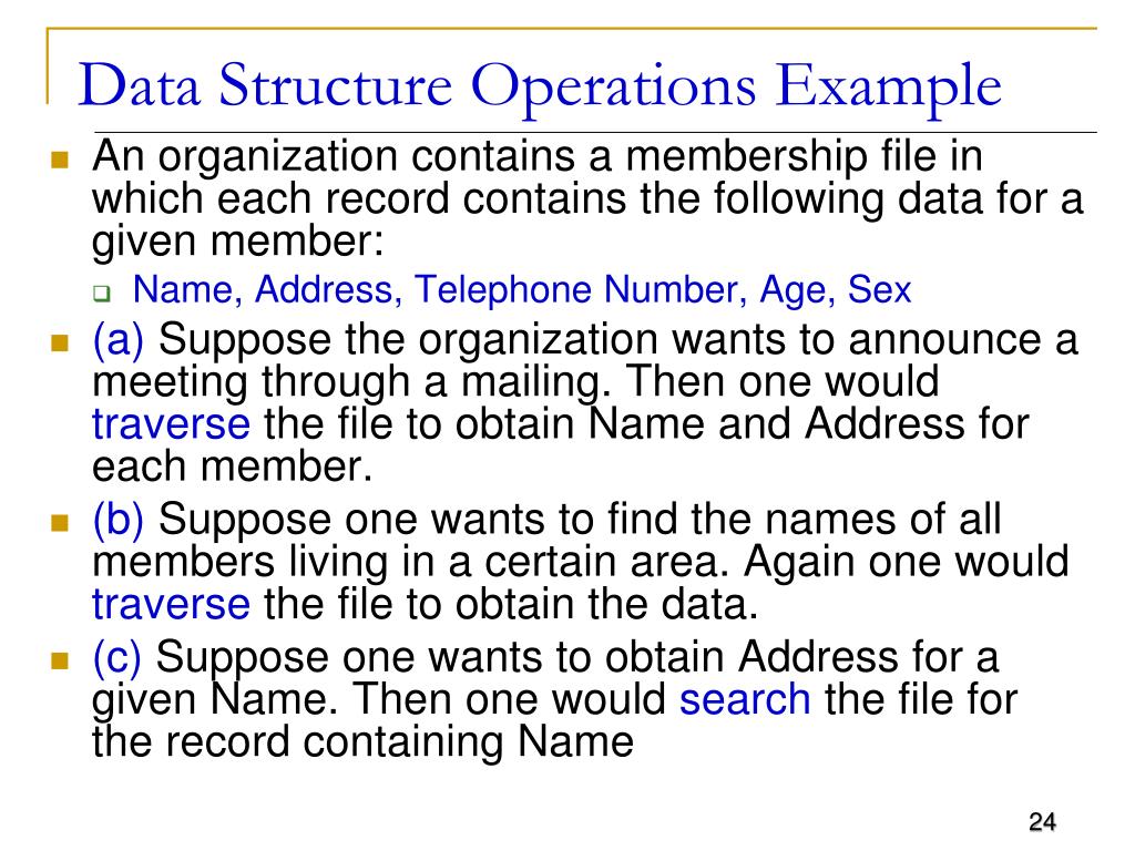 Data Structure Operations Example • An organization contains a membership file in which each record contains the following data for a given member: • Name, Address, Telephone Number, Age, Sex • (a) Suppose the organization wants to announce a meeting through a mailing. Then one would traverse the file to obtain Name and Address for each member. • (b) Suppose one wants to find the names of all members living in a certain area. Again one would traverse the file to obtain the data. • (c) Suppose one wants to obtain Address for a given Name. Then one would search the file for the record containing Name