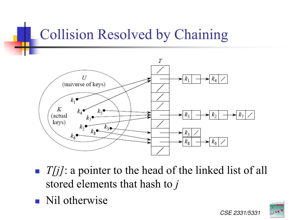 Collision Resolved by Chaining • T[j]: a pointer to the head of the linked list of all stored elements that hash to j • Nil otherwise CSE 2331/5331