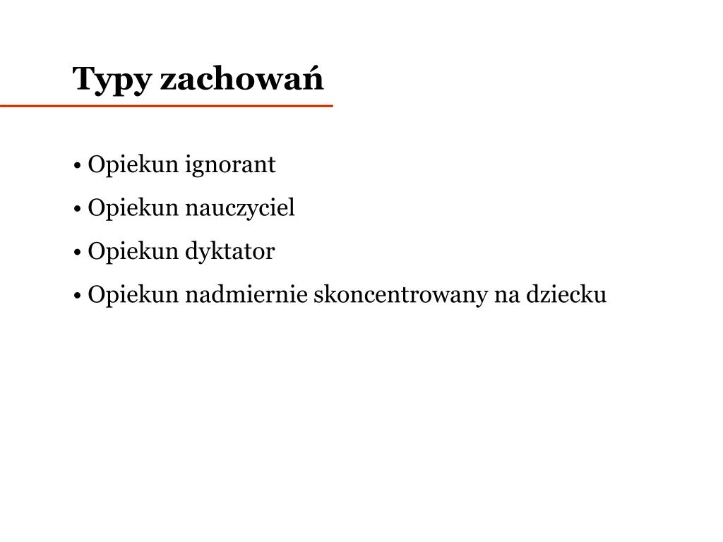 Typy zachowań • Opiekun ignorant • Opiekun nauczyciel • Opiekun dyktator • Opiekun nadmiernie skoncentrowany na dziecku