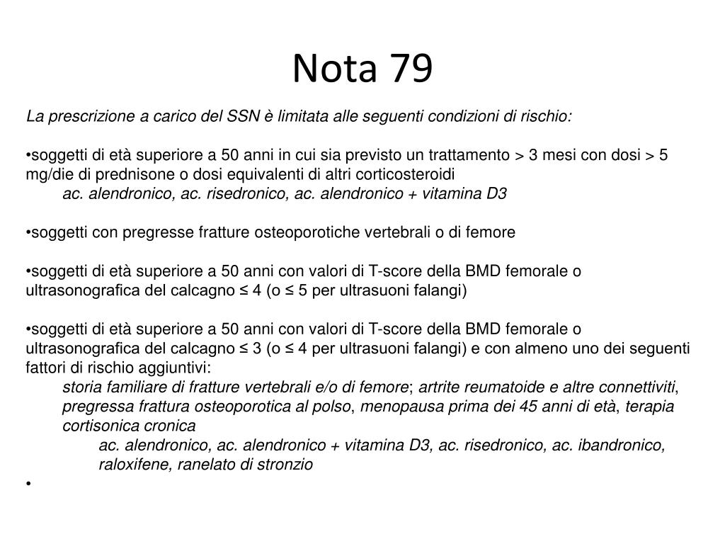 Nota 79 • La prescrizione a carico del SSN è limitata alle seguenti condizioni di rischio: • soggetti di età superiore a 50 anni in cui sia previsto un trattamento > 3 mesi con dosi > 5 mg/die di prednisone o dosi equivalenti di altri corticosteroidi • ac. alendronico, ac. risedronico, ac. alendronico + vitamina D3 • soggetti con pregresse fratture osteoporotiche vertebrali o di femore • soggetti di età superiore a 50 anni con valori di T-score della BMD femorale o ultrasonografica del calcagno ≤ 4 (o ≤ 5 per ultrasuoni falangi) • soggetti di età superiore a 50 anni con valori di T-score della BMD femorale o ultrasonografica del calcagno ≤ 3 (o ≤ 4 per ultrasuoni falangi) e con almeno uno dei seguenti fattori di rischio aggiuntivi: • storia familiare di fratture vertebrali e/o di femore; artrite reumatoide e altre connettiviti, pregressa frattura osteoporotica al polso, menopausa prima dei 45 anni di età, terapia cortisonica cronica • ac. alendronico, ac. alendronico + vitamina D3, ac. risedronico, ac. ibandronico, raloxifene, ranelato di stronzio