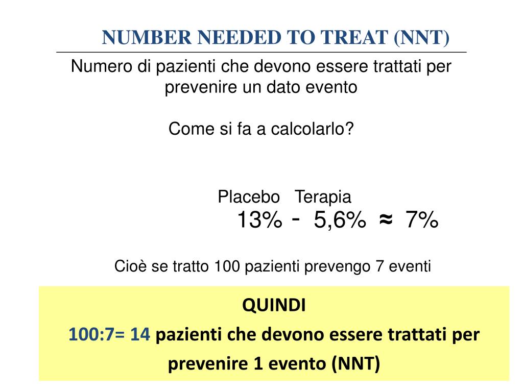 NUMBER NEEDED TO TREAT (NNT) Numero di pazienti che devono essere trattati per prevenire un dato evento Come si fa a calcolarlo? Placebo Terapia 13% - 5,6% ≈ 7% Cioè se tratto 100 pazienti prevengo 7 eventi QUINDI 100:7= 14 pazienti che devono essere trattati per prevenire 1 evento (NNT)