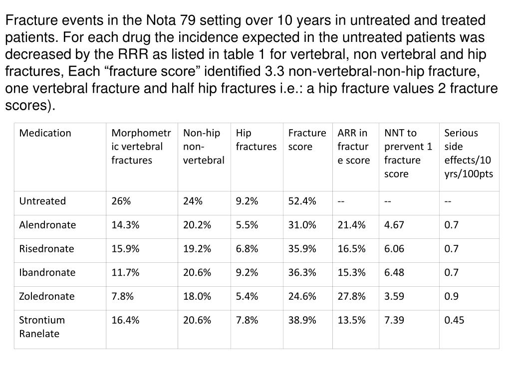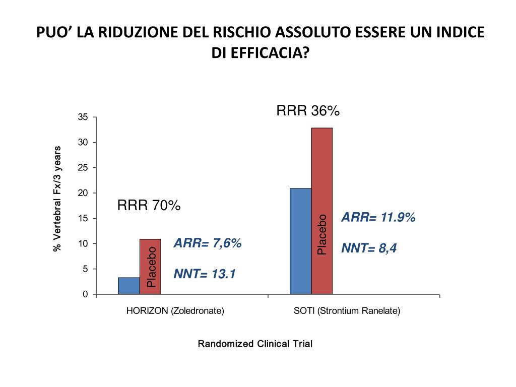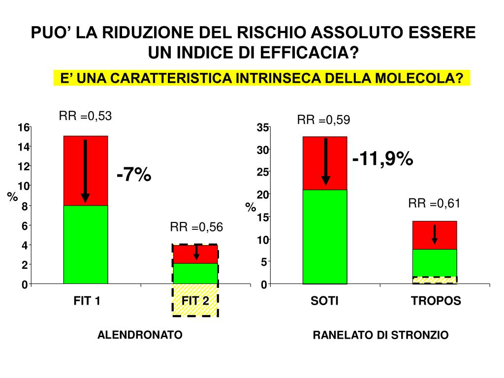 RRR =47% 16 ARR =-7% NNT= 14 14 12 RRR = 44% 10 8 6 4 2 FIT 1 FIT 2 0 E’ UNA CARATTERISTICA INTRINSECA DELLA MOLECOLA? % ARR =-1.5% NNT= 100: 1.5= 67 ALENDRONATO