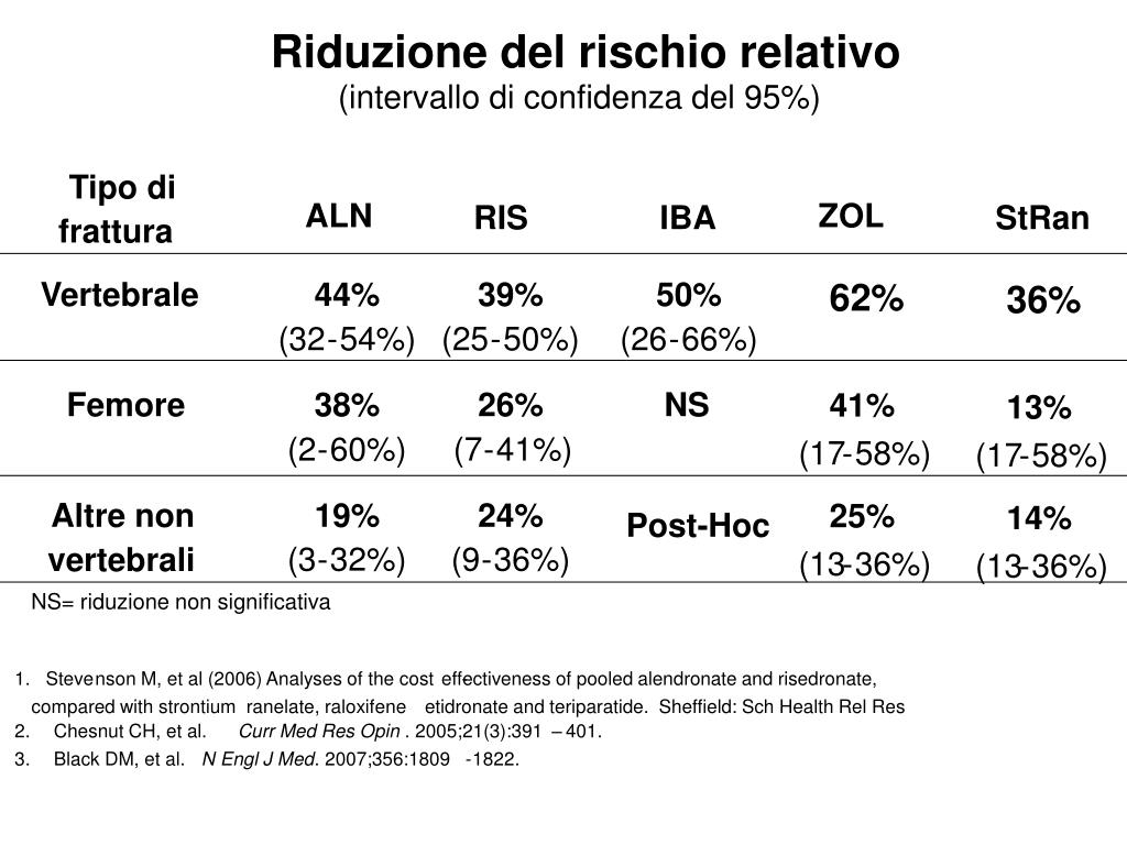 Riduzione del rischio relativo (intervallo di confidenza del 95%) Tipo di ALN ZOL RIS IBA StRan frattura Vertebrale 44% 39% 50% 62% 36% (32 - 54%) (25 - 50%) (26 - 66%) Femore 38% 26% NS 41% 13% (2 - 60%) (7 - 41%) (17 - 58%) (17 - 58%) Altre non 19% 24% 25% 14% Post-Hoc (3 - 32%) (9 - 36%) vertebrali (13 - 36%) (13 - 36%) NS= riduzione non significativa 1. Steve nson M, et al (2006) Analyses of the cost effectiveness of pooled alendronate and risedronate, - compared with strontium ranelate, raloxifene etidronate and teriparatide. Sheffield: Sch Health Rel Res 2. Chesnut CH, et al. Curr Med Res Opin . 2005;21(3):391 – 401. 3. Black DM, et al. N Engl J Med . 2007;356:1809 - 1822.