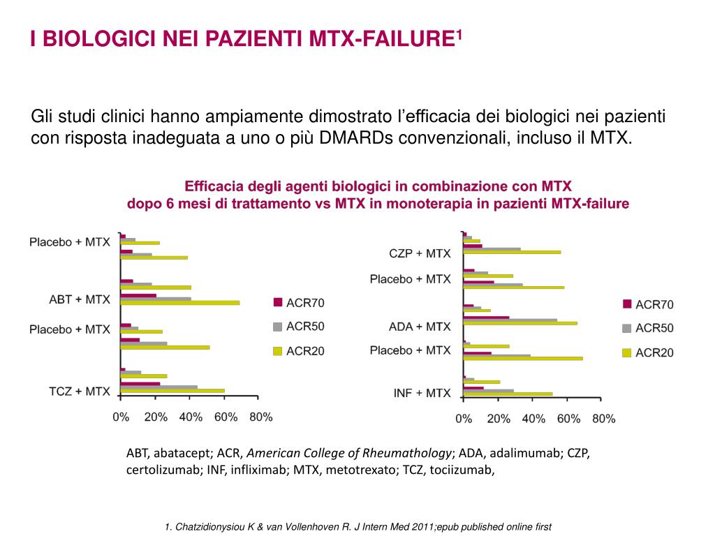 I BIOLOGICI NEI PAZIENTI MTX-FAILURE1 Gli studi clinici hanno ampiamente dimostrato l’efficacia dei biologici nei pazienti con risposta inadeguata a uno o più DMARDs convenzionali, incluso il MTX. ABT, abatacept; ACR, American College of Rheumathology; ADA, adalimumab; CZP, certolizumab; INF, infliximab; MTX, metotrexato; TCZ, tociizumab, 1. Chatzidionysiou K & van Vollenhoven R. J Intern Med 2011;epub published online first