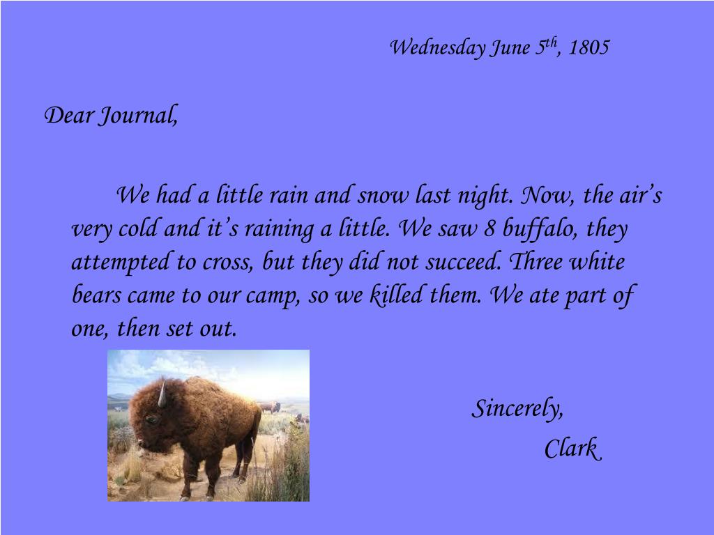 Wednesday June 5th, 1805 Dear Journal, We had a little rain and snow last night. Now, the air’s very cold and it’s raining a little. We saw 8 buffalo, they attempted to cross, but they did not succeed. Three white bears came to our camp, so we killed them. We ate part of one, then set out. Sincerely, Clark