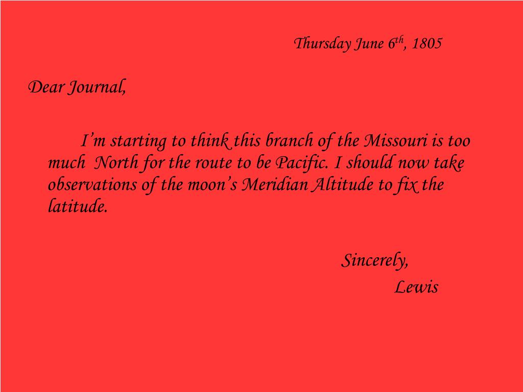 Thursday June 6th, 1805 Dear Journal, I’m starting to think this branch of the Missouri is too much North for the route to be Pacific. I should now take observations of the moon’s Meridian Altitude to fix the latitude. Sincerely, Lewis