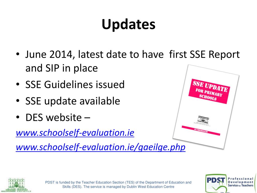 Updates • June 2014, latest date to have first SSE Report and SIP in place • SSE Guidelines issued • SSE update available • DES website – www.schoolself-evaluation.ie www.schoolself-evaluation.ie/gaeilge.php PDST is funded by the Teacher Education Section (TES) of the Department of Education and Skills (DES). The service is managed by Dublin West Education Centre