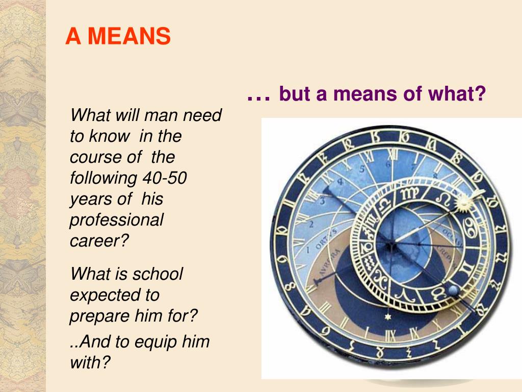 A MEANS … but a means of what? What will man need to know in the course of the following 40-50 years of his professional career? What is school expected to prepare him for? ..And to equip him with?