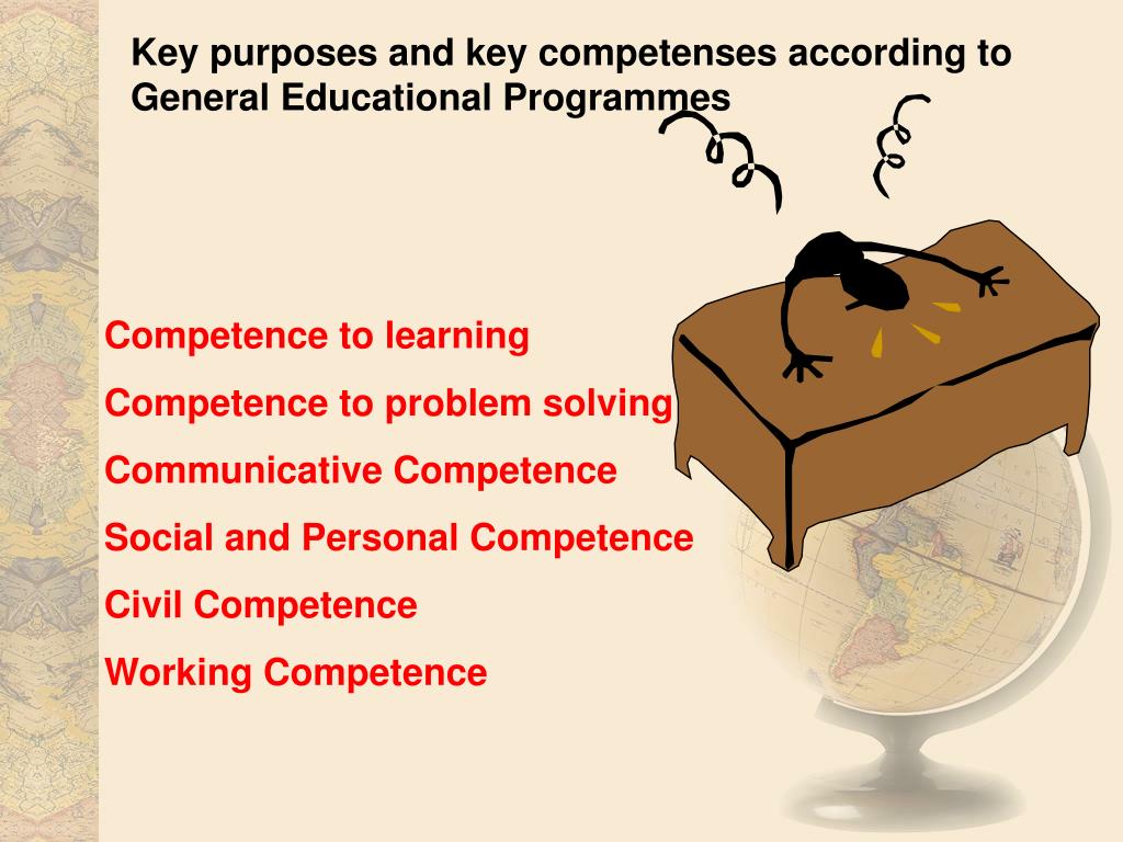 Keypurposes and keycompetensesaccording toGeneral Educational Programmes Competence to learning Competence to problem solving Communicative Competence Social and Personal Competence Civil Competence Working Competence