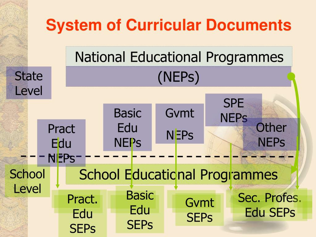 System of Curricular Documents National Educational Programmes (NEPs) State Level SPE NEPs Basic Edu NEPs Gvmt NEPs Other NEPs Pract Edu NEPs School Educational Programmes School Level Basic Edu SEPs Sec. Profes. Edu SEPs Pract. Edu SEPs Gvmt SEPs