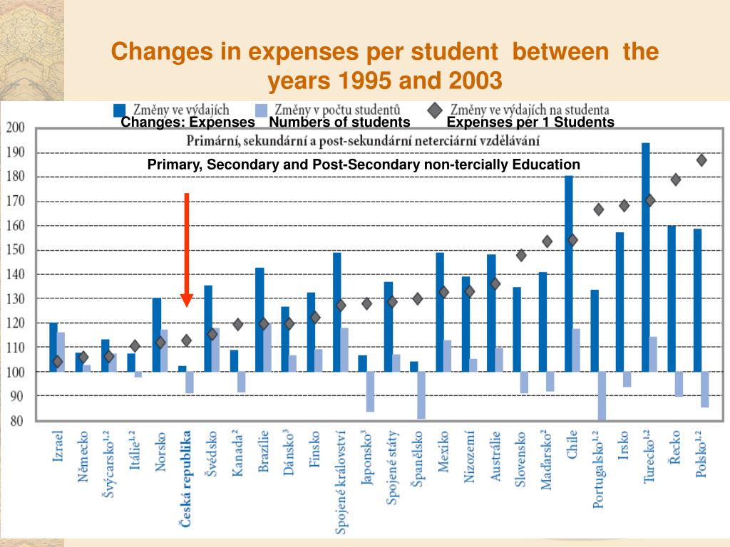 Changes in expenses per student between the years 1995 and 2003 Changes: Expenses Numbers of students Expenses per 1 Students Primary, Secondary and Post-Secondary non-tercially Education