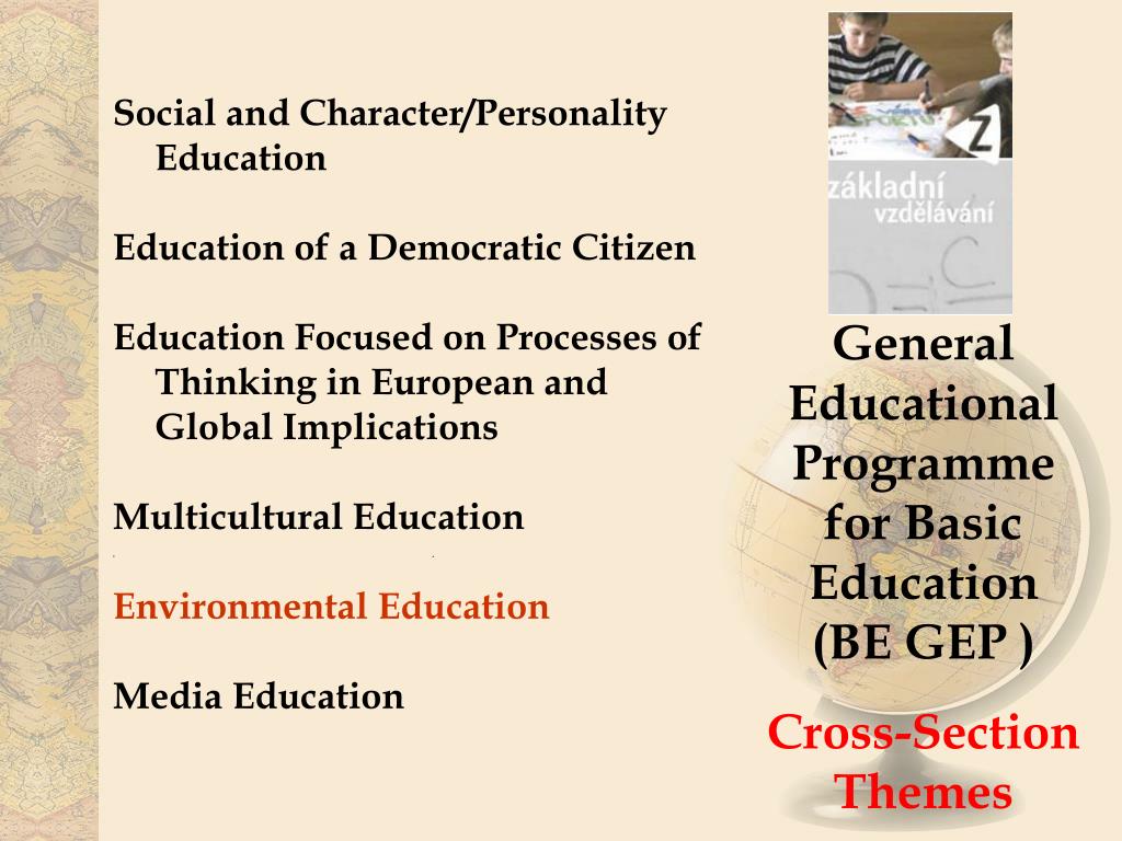 Social and Character/Personality Education Education of a Democratic Citizen Education Focused on Processes of Thinking in European and Global Implications Multicultural Education Environmental Education Media Education General Educational Programme for Basic Education (BE GEP ) Cross-Section Themes