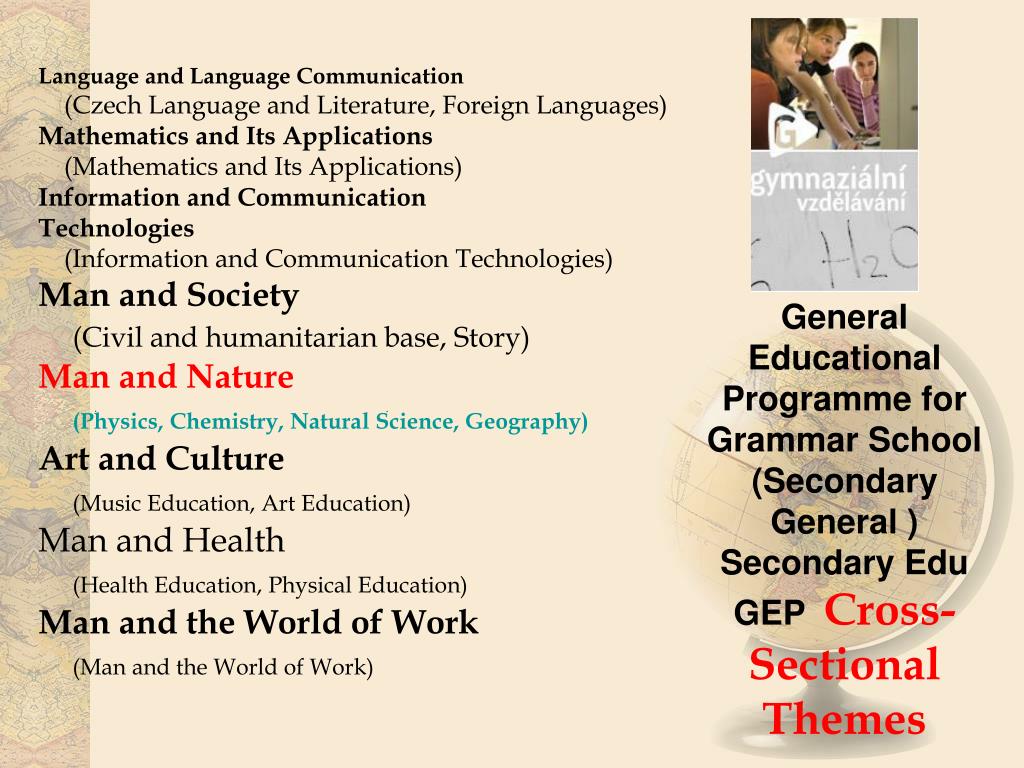 Language and Language Communication (Czech Language and Literature, Foreign Languages) Mathematics and Its Applications (Mathematics and Its Applications) Information and Communication Technologies (Information and Communication Technologies) Man and Society (Civil and humanitarian base, Story) Man and Nature (Physics, Chemistry, Natural Science, Geography) Art and Culture (Music Education, Art Education) Man and Health (Health Education, Physical Education) Man and the World of Work (Man and the World of Work) General Educational Programme for Grammar School(Secondary General ) Secondary Edu GEP Cross-Sectional Themes