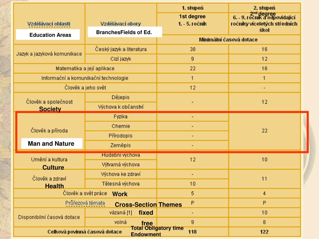 2nd degree 1st degree BranchesFields of Ed. Education Areas Society Man and Nature Culture Health Work Cross-Section Themes fixed free Total Obligatory time Endowment
