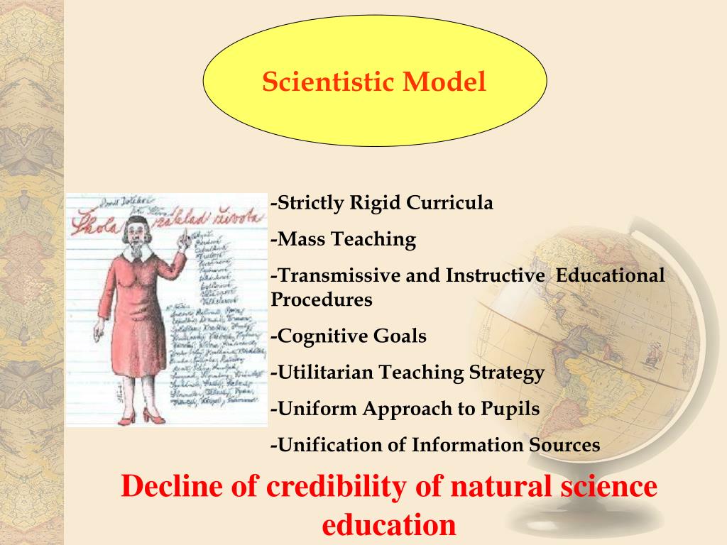 Scientistic Model -Strictly Rigid Curricula -Mass Teaching -Transmissive and Instructive Educational Procedures -Cognitive Goals -Utilitarian Teaching Strategy -Uniform Approach to Pupils -Unification of Information Sources Decline of credibility of natural science education