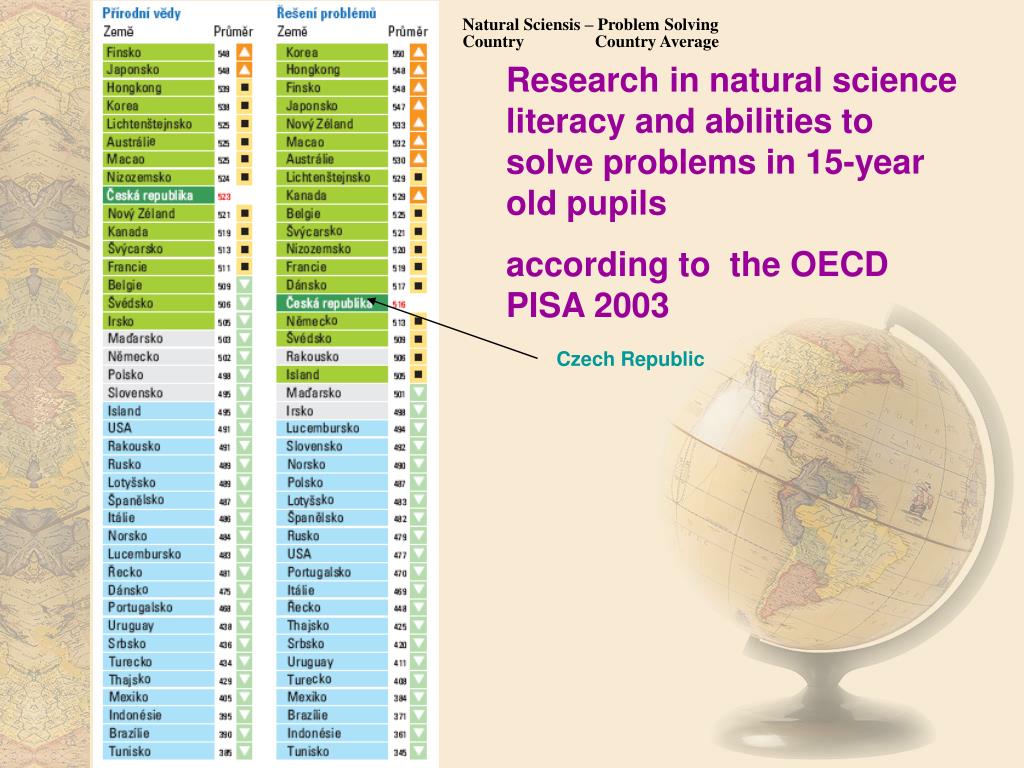 Natural Sciensis – Problem Solving Country Country Average Research in natural science literacy and abilities to solve problems in 15-year old pupils according to the OECD PISA 2003 Czech Republic