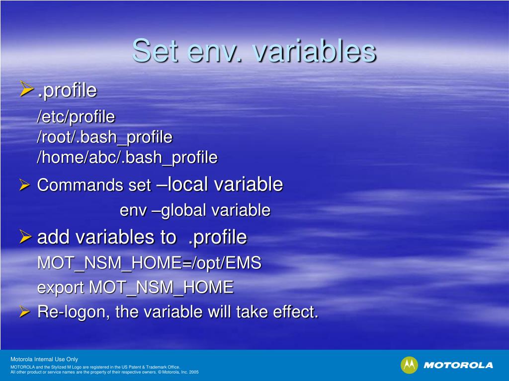 Set env. variables • .profile /etc/profile /root/.bash_profile /home/abc/.bash_profile • Commands set –local variable env –global variable • add variables to .profile MOT_NSM_HOME=/opt/EMS export MOT_NSM_HOME • Re-logon, the variable will take effect.