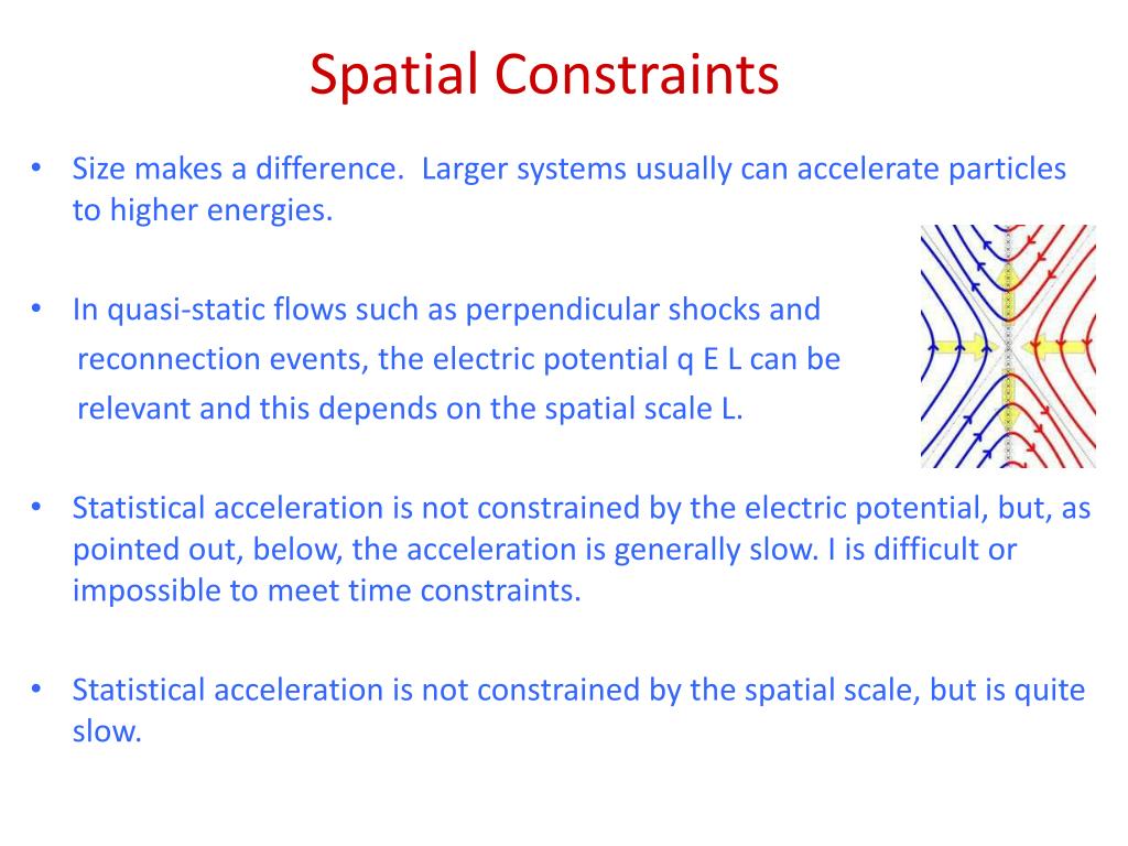 Spatial Constraints • Size makes a difference. Larger systems usually can accelerate particles to higher energies. • In quasi-static flows such as perpendicular shocks and reconnection events, the electric potential q E L can be relevant and this depends on the spatial scale L. • Statistical acceleration is not constrained by the electric potential, but, as pointed out, below, the acceleration is generally slow. I is difficult or impossible to meet time constraints. • Statistical acceleration is not constrained by the spatial scale, but is quite slow.