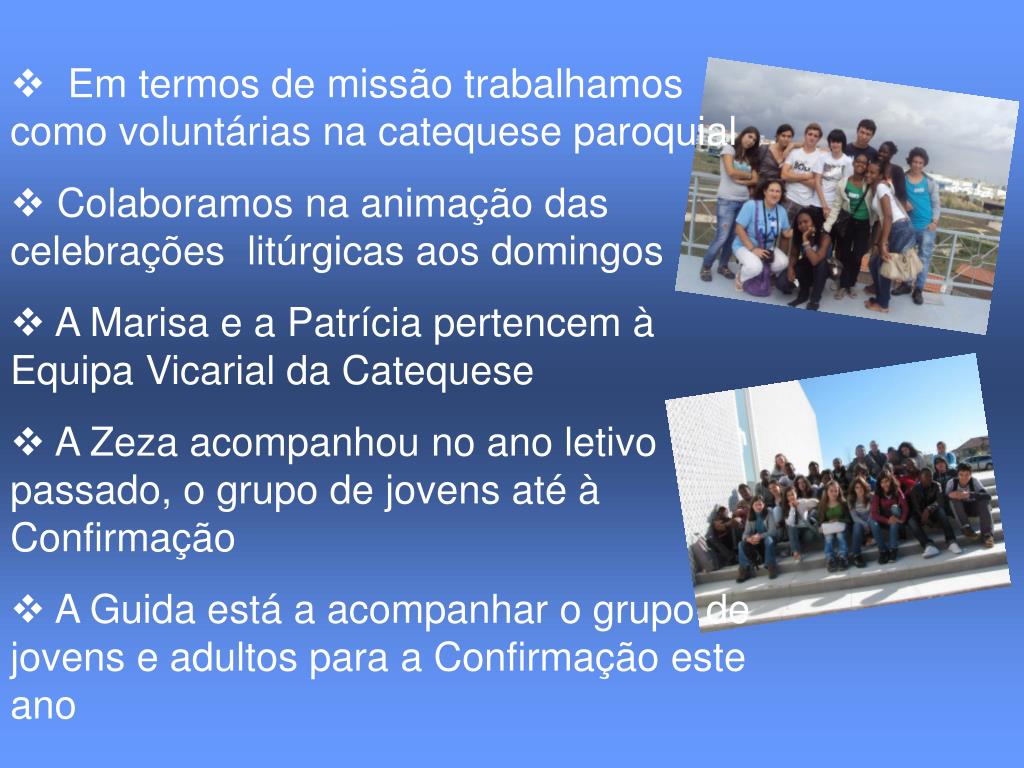 Em termos de missão trabalhamos como voluntárias na catequese paroquial • Colaboramos na animação das celebrações litúrgicas aos domingos • A Marisa e a Patrícia pertencem à Equipa Vicarial da Catequese • A Zeza acompanhou no ano letivo passado, o grupo de jovens até à Confirmação • A Guida está a acompanhar o grupo de jovens e adultos para a Confirmação este ano