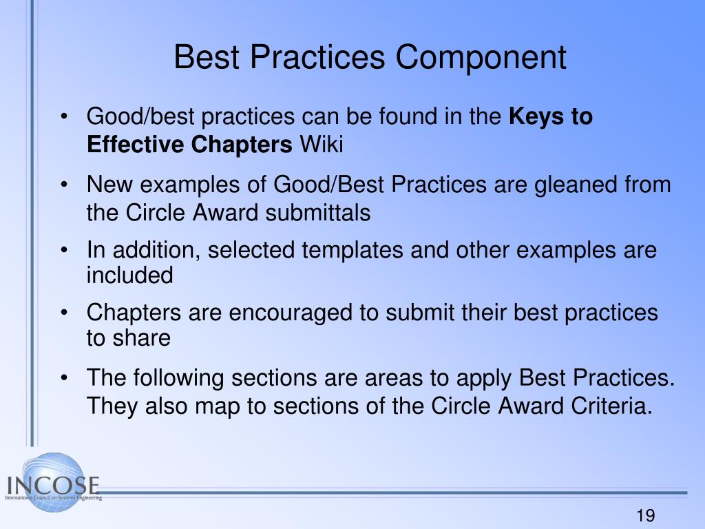 Best Practices Component • Good/best practices can be found in the Keys to Effective Chapters Wiki • New examples of Good/Best Practices are gleaned from the Circle Award submittals • In addition, selected templates and other examples are included • Chapters are encouraged to submit their best practices to share • The following sections are areas to apply Best Practices. They also map to sections of the Circle Award Criteria.