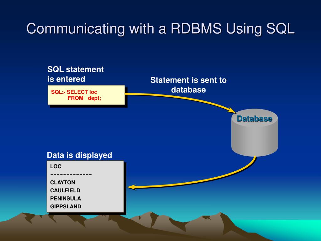 SQL statementis entered Statement is sent to database SQL> SELECT loc FROM dept; Database Data is displayed LOC ------------- CLAYTON CAULFIELD PENINSULA GIPPSLAND Communicating with a RDBMS Using SQL