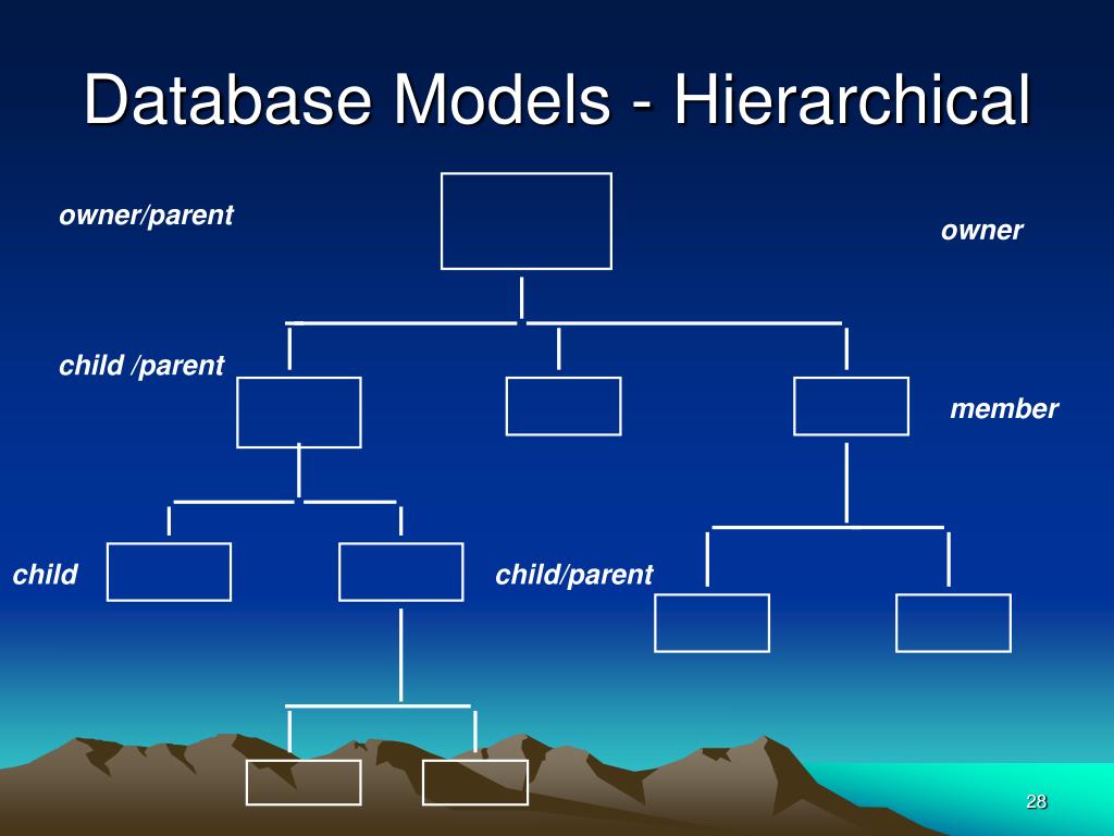 Database Models - Hierarchical owner/parent child /parent owner member child child/parent